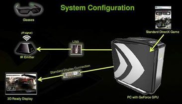 Mais le principal inconvénient du GeForce 3D Vision, c’est qu’il faut obligatoirement posséder du matériel dernier cri pour en tirer partie : une carte graphique NVIDIA récente, un moniteur fonctionnant à 100 Mhz minimum et bien sûr un processeur (et la RAM qui va avec..) capable de faire tourner les derniers jeux à la mode dans de bonnes conditions.
