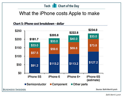 Alors que l’iPhone 6S coûte entre 749€ et 969€ chez Apple, une étude réalisée par « Bank of America Merrill Lynch » révèle qu’en réalité le terminal ne coûterait que 234 dollars de composants à Apple.