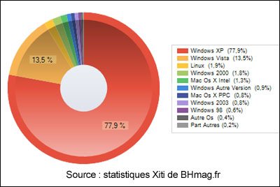 D’ailleurs d’après nos statistiques internes : 77,9% des lecteurs de BHmag.fr utilisent encore Windows XP contre seulement 13,5% pour Windows Vista. Un gouffre énorme !! Preuve que Windows XP n’est pas mort.. loin de là… et que le nouvel OS de Microsoft doit surtout son « demi succès » par le fait qu’il est fourni d’origine avec la quasi totalité des PC neufs.