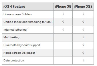 La firme de Cupertino a par ailleurs publié sur cette page un tableau récapitulatif permet de connaître quelles fonctions de iOS 4 sont prises en charge par l’iPhone 3G et l’iPhone 3GS :