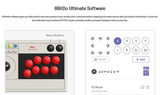 Le stick arcade dispose d’un joystick de couleur noire et de huit boutons de couleur rouge qui correspondent aux traditionnels boutons A, B, X, Y, R1, R2, L1 et L2. La manette propose également d’autres fonctions comme par exemple la possibilité d’activer un mode Turbo. A noter aussi la présence de boutons P1 et P2 permettant de créer des macros à l’aide du programme 8BitDo Ultimate Software.