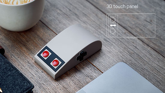 En effet, sa souris N30 reprend les coloris et le design de la mythique manette de la console Nintendo NES. Le mulot est équipé de deux boutons rouge vifs qui ne sont pas sans rappeler les fameux boutons A et B de la manette originelle. On trouve aussi sur le côté une croix directionnelle pour accéder aux pages précédentes et suivantes. A noter aussi la présence (à peine visible) d’une zone tactile située entre les deux boutons rouges. Cette zone tactile fait office de molette de défilement. Il suffit donc d’y faire glisser son doigt vers le haut ou le bas pour faire défiler la page web (ou le tableau excel) que vous êtes en train de consulter.