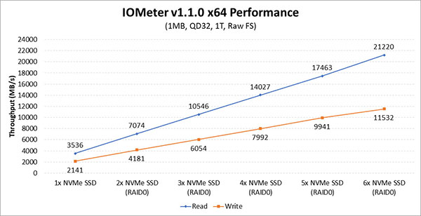 AMD a par exemple pu atteindre des taux de transferts de 21,2 Go/s en lecture et de 11,53 Go/s en écriture grâce à un RAID0 de 6 SSD Samsung 960 Pro NVMe d’une capacité de 512 Go chacun..