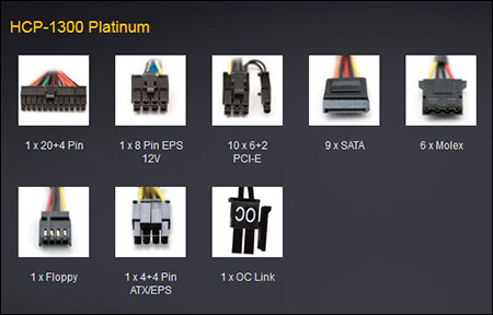 L’alimentation HCP-1300 Platinum est un bloc 100% modulaire refroidie à l’aide d’un ventilateur de 135 mm L’alimentation dispose de 4 rails de 12 Volts. Au niveau de la connectique, elle propose : 9 prises SATA, 6 Molex, 1 Floppy, 10 PCI-Express (6+2 pins), 1 connecteur 24 pins (20+4) pour la carre mère, 1 connecteur 8 pins, 1 connecteur 8 pins (4+4) et 1 connecteur OCLink pour relier deux alimentations entre elles.