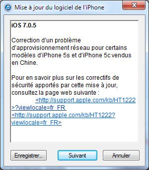 A noter que selon les premiers retours, iOS 7.0.5 peut toujours être jailbreaké grâce au programme Evasi0n.