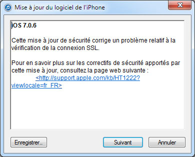 En effet, Apple a mis en ligne iOS 7.0.6 pour colmater une faille de sécurité relative à la vérification de la connexion SSL de se appareils. Cette mise à jour est compatible avec les iPhone 4, les iPhone 4S, les iPhone 5, les iPhone 5C, les iPhone 5S, les iPad Mini, les iPad mini Retina, les iPad 2, les iPad 3, les iPad 4, les iPad Air et les iPod Touch 5G.