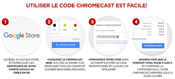 – Puis un second mail vous donnera un code qu’il suffira d’utiliser sur le Google Store pour passer commande gratuitement du Chromecast 2.0 noir (seule cette couleur est éligible). Un numéro de carte bancaire sera demandé mais rassurez-vos rien ne sera débité puisque vous avez déjà réglé le ChromeCast 2.0 sur PriceMinister. La livraison est en plus offerte.