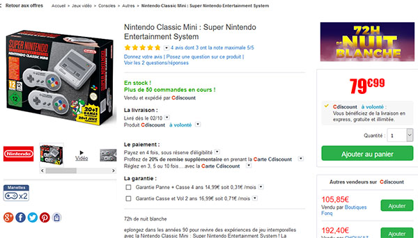 Pour ceux que cela intéressent, la Super Nes Mini est disponible en ce moment à 79,99€ sur les sites suivants :