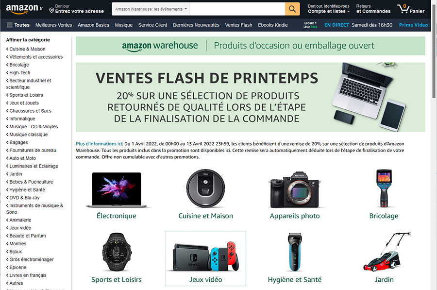 A noter que parallèlement à ces ventes flash, l’enseigne offre aussi 20% de remise sur les produits de sa rubrique Amazon Warehouse.