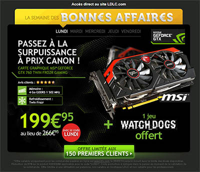 Si vous êtes du genre à avoir le joystick qui vous titille, sachez que la boutique LDLC propose en ce moment une chouette promo qui devrait ravir le gamer qui sommeille en vous. En effet, l’enseigne brade aujourd’hui (et uniquement aujourd’hui !!) une carte graphique GeForce GTX 760 avec 4 Go de mémoire à moins de 200 euros. Et en plus pour ce prix la livraison est offerte en points relais et le jeu Watch_Dog vous est offert par NVIDIA.