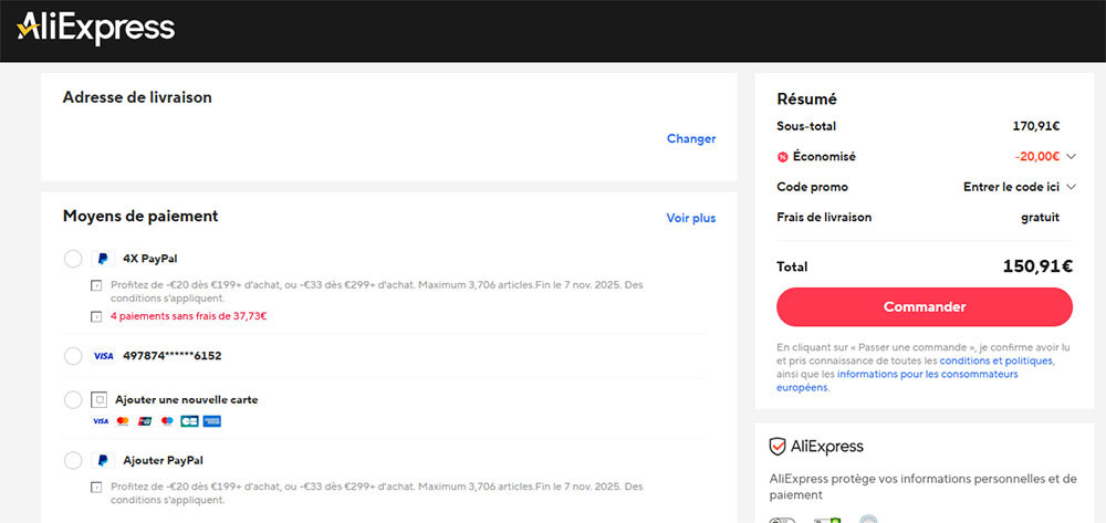 A noter qu’en réglant par Paypal. Vous pouvez également obtenir 20€ de remise supplémentaire sur les commandes d’au moins 199€ d’achats.