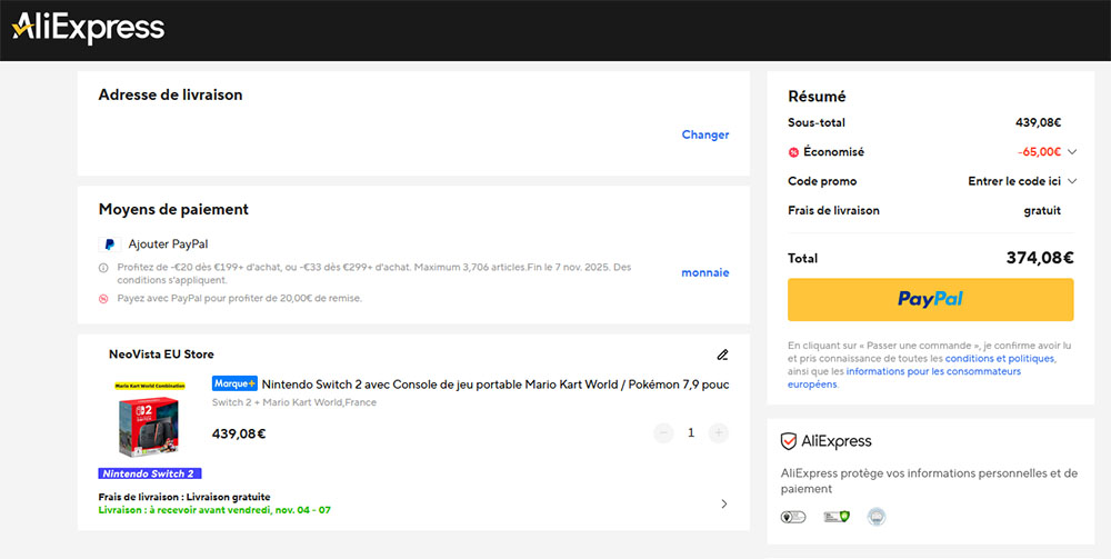 Par exemple, le pack Nintendo Switch 2 + Mario Kart World qu’on trouve à 454,90€ sur Amazon.fr ne coûte plus que 374,08€ sur Aliexpress en indiquant le code promo FRCD45 et en réglant par Paypal.