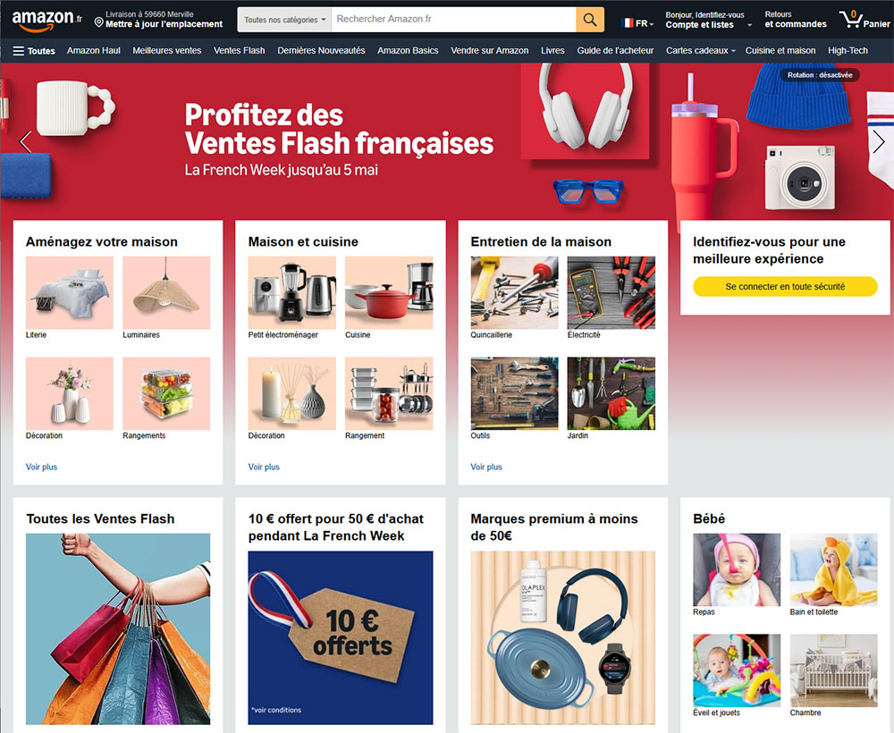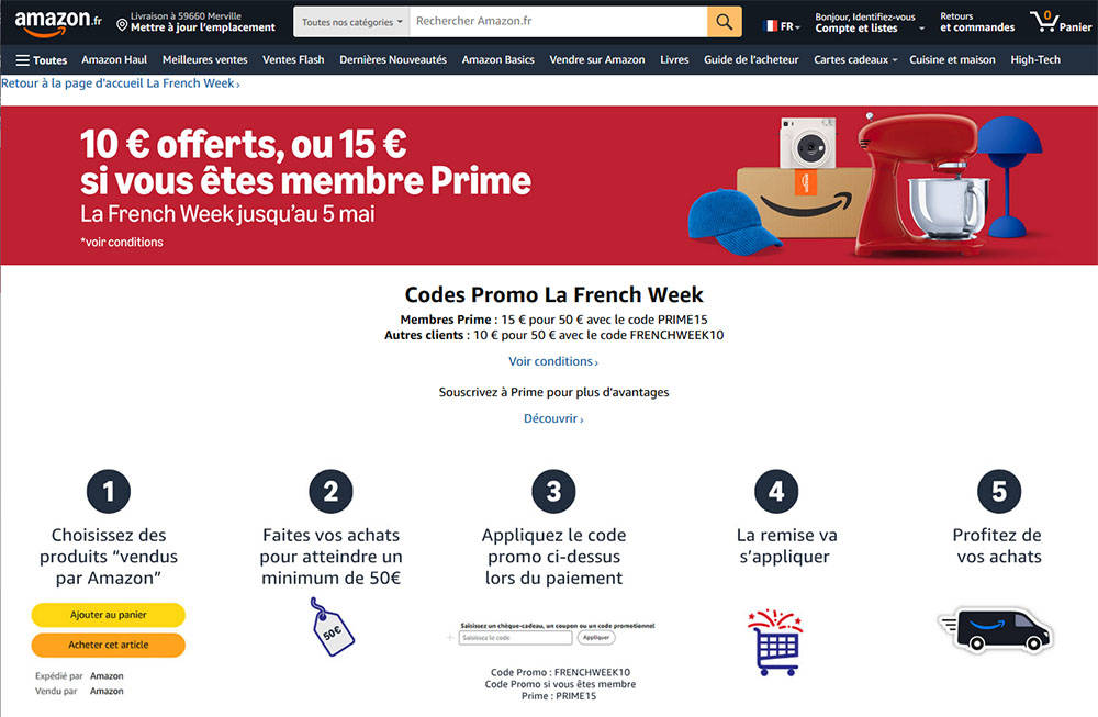 - Pour tout le monde : 10€ dès 50€ d’achats sur Amazon.fr avec le code FRENCHWEEK10