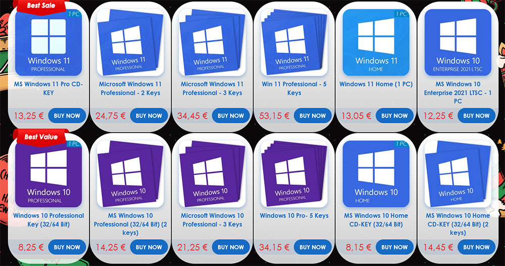 - Lot de 50 clés Windows 10 Professional à 325€ (soit 6,50€/clé)