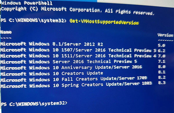 En effet, c’est en utilisant la fonctionnalité « Get-VMHostSupportedVersion » en ligne de commande qu’ils ont découvert l’information. Le prochain opus de Windows 10 sera donc la « Spring Creators Update 1803« . Pour information, les chiffres 1803 font référence à la date de sortie de la mise à jour : 18 pour l’année 2018 et 03 pour le mois de mars. La mise à jour précédente de Windows 10, la Fall Creators Update 1709, fut en effet lancée en septembre 2017.