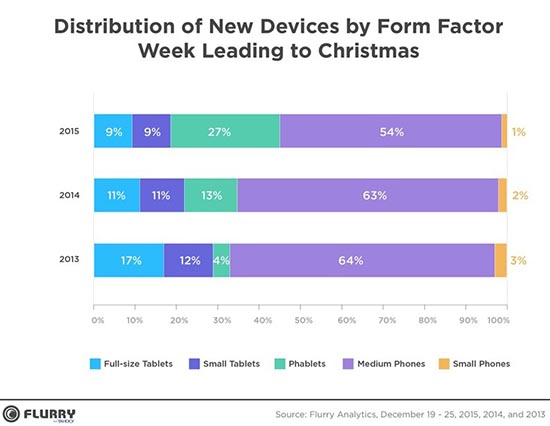 D’après les analyses de Flurry Insights, les samrrtphones de grandes tailles ont largement été plébiscité à Noël puisque 54% des appareils activés sont des téléphones de grandes tailles. 27% sont des phablets, 9% des petites tablettes, 9% des grandes tablette et le dernier pourcentage restant (1%) des petits téléphones.