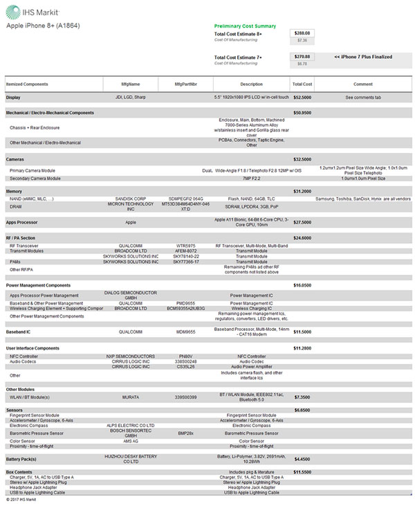 Le cabinet IHS Markit vient d’estimer le prix des nouveaux smartphones d’Apple en prenant en compte le coût de chaque composant des terminaux. La firme révèle que le coût de fabrication des iPhone 8 et 8 Plus est plus élevé que les iPhone 7 et 7 Plus, d’où leur prix de vente plus élevé (de 50 à 30$ respectivement).