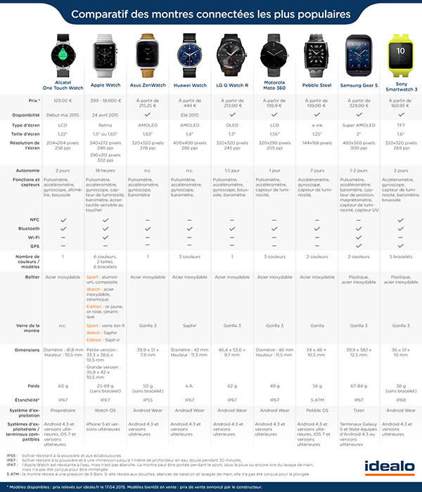 Voici un tableau qui récapitule les différents modèles de montres connectées disponibles (ou prochainement disponibles) dans le commerce. Merci à Idealo our cette infographie.
