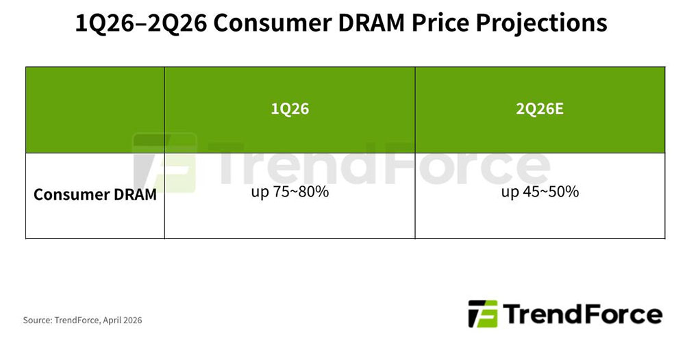 D’après sa dernière étude, TrendForce prévoit que les prix contractuels de la DRAM grand public vont continuer d’augmenter de 45 à 50% au cours du deuxième trimestre 2026.