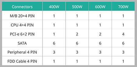 Quatre versions sont disponibles : 400 Watts, 500 Watts, 600 Watts et 700 Watts. Le nombre de connecteurs proposés varie d’un modèle à l’autre en fonction de sa puissance :