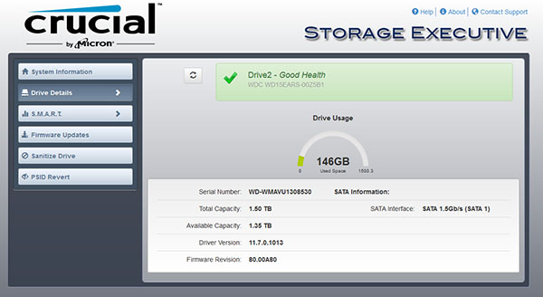 Crucial Storage Executive est en mesure de mentionner les détails techniques de n’importe quel disque quel que soit la marque et le modèle. Par contre, les possesseurs d(n SSD récent de chez Crucial (c’est à dire un SSD M500, M550, MX100, MX200 ou BX100) auront accès à un peu plus d’options comme par exemple la possibilité de mettre à jour directement le firmware de leur SSD depuis le programme, la possibilité de réinitialiser le chiffrement sur le disque, surveiller la température du disque, etc…