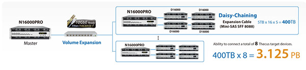 Ce nouveau seuil de capacité change la donne pour les entreprises qui nécessitent de large volume pour leur données. Si une baie NAS Thecus N16000PRO est chargée de disques durs de 5To, elle sera capable de stocker plus de 80To de donnée, et davantage avec la technologie “daisy chain”, en attachant quatre unités de stockage JBOD D16000 (chacune ayant 16 nouveaux emplacements disque) à un NAS « maitre » N16000PRO, il en résultera une capacité de stockage de 400To.