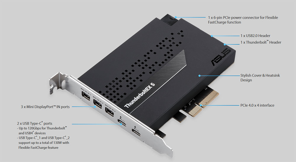 Le constructeur ASUS annonce la sortie d’une nouvelle carte d’extension : la ThunderboltEX 5 qui succède à la ThunderboltEX 4.