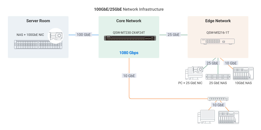 Le QSW-M7230-2X4F24T réunit deux ports QSFP28 100 GbE, quatre ports SFP28 25 GbE et vingt-quatre ports RJ45 10 GbE sur une seule plateforme. Cette conception multi-débits permet aux entreprises de déployer du 25 GbE ou du 100 GbE là où les performances sont les plus critiques, tout en conservant l’infrastructure 10 GbE existante.