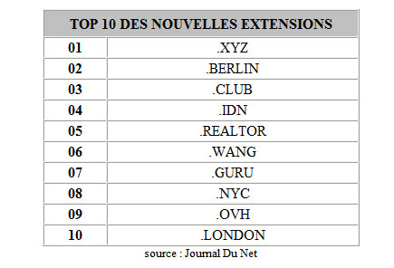 En 2013, une cargaison de nouvelles extensions ont vu le jour et ont détendu le marché du nom de domaine quelque peu saturé. Sous la tutelle de l’organisme américain ICANN, les dénominations définissent maintenant des localités particulières (.paris), des activités (.voyage), ou bien expriment des idées plus vagues (.today). Dans le top 3 énoncé en fin d’année 2014 par le Journal du Net, on retrouve les extensions de noms de domaine .xyz, suivit de .berlin et enfin .club. Les noms de domaine peuvent être achetés par tout un chacun via des sites tels que 1&1 par exemple.