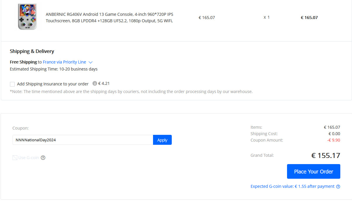 MAJ le 04/10/2024 : la console Anbernic RV406 s’affiche à 165,07€ sur Geekbuying mais son prix peut passer à 155,17€ sur Geekbuying en mentionnannt le code promo NNNNationalDay2024 qui donne droit à 6% de remise.
