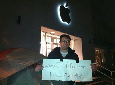 A noter que Justin n’en est pas à son coup d’essai puisqu’il a déjà campé devant plusieurs Apple Stores lors de la sortie de précédents produits Apple (iPhone et iPod Touch apparemment). On l’a déjà aperçu dans cette actualité par exemple. Fier de lui, Justin avoue même que c’est la quatrième fois qu’il arrive à se placer premier de la fil d’attente…