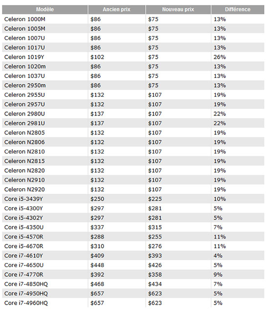 La firme de Santa Clara a décidé de revoir à la baisse le prix de certains processeurs pour PC portables et PC de bureau. Le tarif des processeurs Celeron M, Core i5 et Core i7 est donc réduit. Et comme on peut le voir dans le tableau ci-dessous la baisse varie de 4 à 26% suivant les modèles.