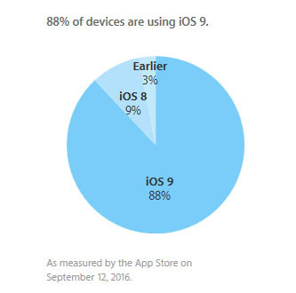 L’adoption d’iOS 10 a été très rapide puisque, comme vous pouvez le voir ci-dessous, iOS 9 représentait encore 88% de parts de marché le mois dernier à la date du 12 septembre.