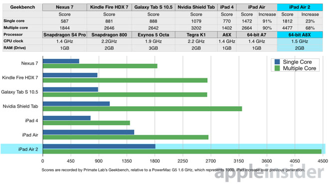Les premiers benchs de l’iPad Air 2 commencent à tomber et le moins que l’on puisse dire c’est que la nouvelle tablette d’Apple est très très puissante ! Il faut dire que l’iPad Air 2 est équipée d’un processeur A8X triple cores cadencé à 1,5 GHz et secondé par 2 Go de RAM. Elle obtient des scores sans commune mesure avec ce que propose les autres terminaux mobiles d’Apple et se révèle même plus véloce que les appareils concurrents, y compris la nouvelle Nexus 9 de Google.