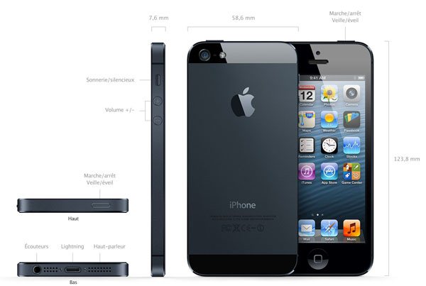 L’iPhone 5 est plus grand, il mesure 123,8 mm de haut contre 115,2 mm pour les modèles précédents. Il est aussi le plus fin des iPhone avec seulement 7,6 mm d’épaisseur (contre 9,3 auparavant). Et enfin son poids n’excède pas 112 grammes (contre 140gr sur le 4S).