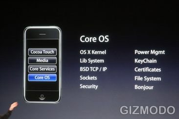– le kit de développement (SDK) est disponible dès maintenant (ici) pour les développeurs. A noter qu’il fonctionne que sur MAC Intel.Il est gratuit mais les développeurs devront s’enregistrer et s’acquitter de 100 dollars pour que leurs programmes soient publiés sur AppStore. Pour information, sachez qu’il s’agit du même SDK que celui utilisé en interne par Apple. Les différentes couches logicielles de l’iPhone y sont accessibles : Cocoa Touch, Media, Core Services, Core OS. Pas d’accès prévu par contre pour l’instant au connecteur dock.