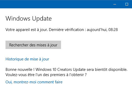 Dans notre cas, la recherche de mises jour de Windows Update mentionne sur notre PC de test : « Bonne nouvelle ! Windows 10 Creators Update sera bientôt disponible. Voulez-vous être l’un des premiers à l’obtenir ?«