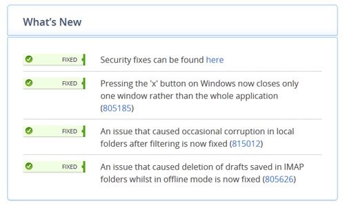 Pour cet opus, la fondation Mozilla a peaufiné légèrement son logiciel de messagerie en corrigeant quelques problèmes de sécurité et en supprimant plusieurs bugs, dont vous trouverez le détail ici.