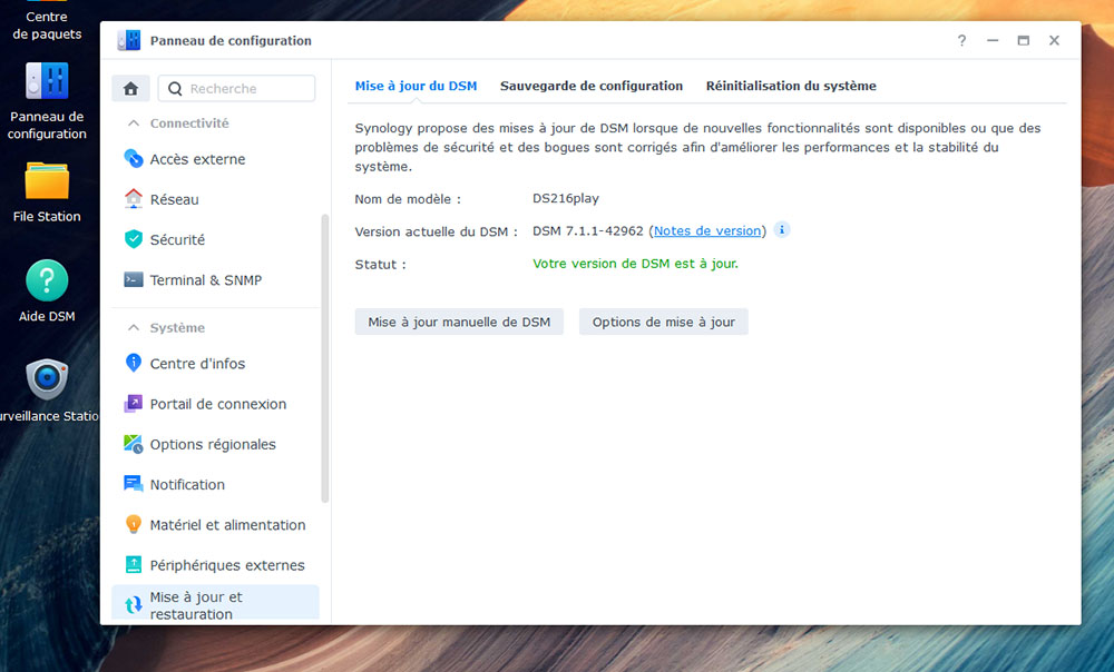 Pour le moment, cette version très récente ne semble pas encore déployée pour tous les NAS, il n’est donc pas encore possible d’effectuer une mise à jour automatique via le « Panneau de configuration » de DSM puis « Mise à jour et restauration ». Il est donc nécessaire de de se rendre à ce même endroit et de lancer une mise à jour manuelle après avoir téléchargé le fichier de mise à jour de votre NAS via le Centre de Téléchargement de Synology.