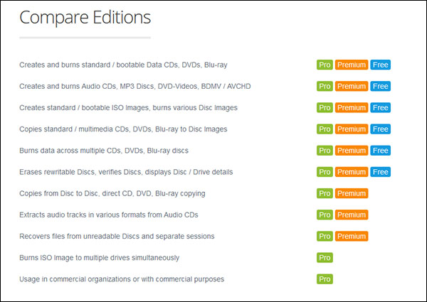 Pour information, Burn Aware 10.0 est proposé comme les versions précédentes en trois éditions : une gratuite (la « Free ») et deux payantes : la Pro (40$) et la Premium (20$). Dans la majorité des cas, la version Free gratuite est amplement suffisante pour la plupart des tâches. C’est d’ailleurs celle que nous vous recommandons et que nous proposons sur la fiche logicielle de Burn Aware dans notre section Téléchargement.