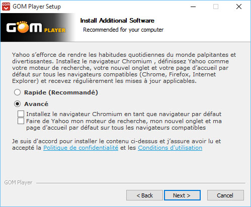 Attention : GomPlayer installe par défaut le navigateur Chromium et fait de Yahoo votre moteur de recherches par défaut si vous faîtes une installation « rapide ». Pendant l’installation, pensez donc à sélectionnez l’installation « avancée » qui vous permettra de désélectionner les cases pré-cochées.