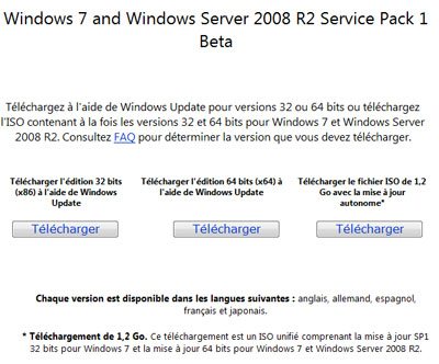 La beta du Service Pack 1 de Windows 7 et de Windows Server 2008 R2 est disponible en téléchargement sur cette page du site Technet de Microsoft.