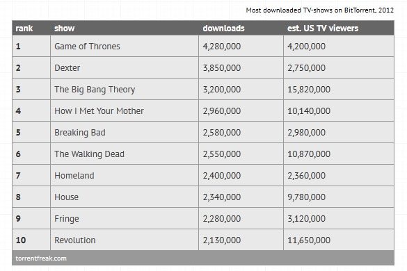 Comme tous les ans à la même période, le site Torrentfreak a mis en ligne le TOP 10 des séries TV les plus piratées sur BitTorrent durant l’année. Cette année, c’est la série américaine Game of Thrones qui arrive en tête avec près de 4.280.000 téléchargements. Suivi par Dexter et ses 3.850.000 téléchargements, The Big Bang Theory (3,2 millions), How I Meet Your Mother (2,96 millions), Breaking Bad (2,58 millions), The Walking Dead (2,55 millions), Homeland (2,4 millions), Dr House (2,34 millions), Fringe (2,28 millions) et enfin Revolution (2,13 millions)