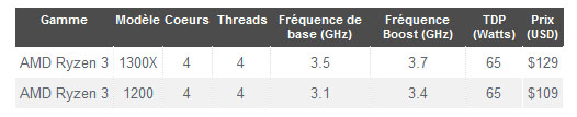 La gamme Ryzen 3 se compose à ce jour de deux modèles : le Ryzen 3 1200 et et le Ryzen 3 1300X : deux processeurs quadri cœurs / 4 threads cadencés respectivement à 3,1 GHz (3,4 en boost) et 3,5 GHz (3,7 en boost). Le premier est annoncé au prix de vente officiel de 109$ tandis que le second coûte 129$.