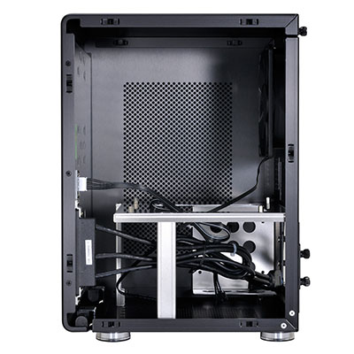 Au niveau du stockage, le PC-Q33 dispose d’un espace modulable. Dans la cage latérale, deux disques durs de 3,5” ou un de 2,5” et un de 3,5” peuvent être installés. Cette cage latérale peut même être retirée en enlevant une vis à main. De son côté, le panneau avant peut aussi recevoir jusqu’à trois disques 2,5” ou un disque 3,5” et deux disques 2,5”. Le PC-Q33 offre en façade deux ports USB et des prises audios.