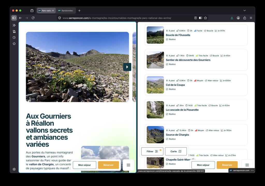 Affichez deux pages côte à côte dans une seule fenêtre grâce à la nouvelle fonctionnalité Vue fractionnée. Comparez plus facilement les informations, effectuez des recherches ou travaillez simultanément sur deux pages. Pour créer une vue fractionnée, sélectionnez un ou deux onglets et choisissez Ajouter à la vue fractionnée ou Ouvrir en vue fractionnée.