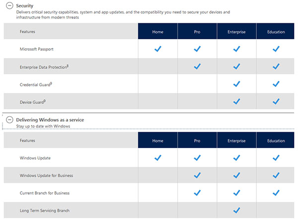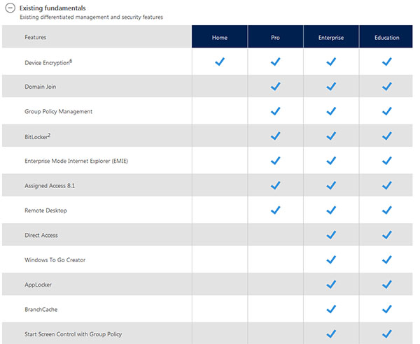 Afin de fournir de plus amples détails à propos de Windows 10, Microsoft a publié sur son site web un tableau comparatif dans lequel il passe en revue toutes les fonctionnalités des différentes éditions de Windows 10. Rappelons en effet que Windows 10 sera décliné en tout en 7 éditions différentes (Home, Pro, Entreprise, Education, Mobile, Mobile Entreprise et loT Core).