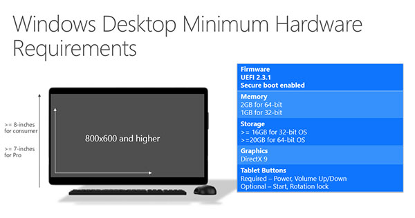 Sur PC, la machine devra avoir un écran d’au moins 7 pouces et être capable d’afficher une résolution minimale de 800 x 600 pixels. Un espace de stockage d’au moins 16 Go et minimum 1 Go de RAM sont requis pour les plateformes 32-bit, tandis qu’il faudra disposer d’au minimum 20 Go de stockage et 2 Go de RAM pour les versions 64-bit.
