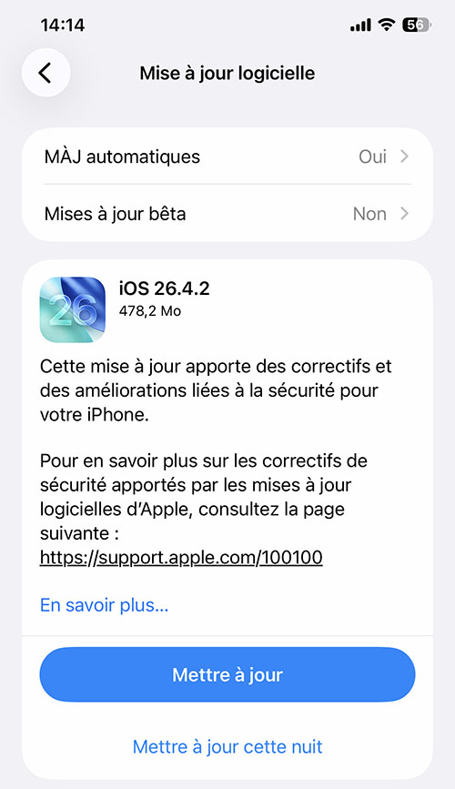 Apple déploie iOS 26.4.2 sur les iPhone et améliore la sécurité