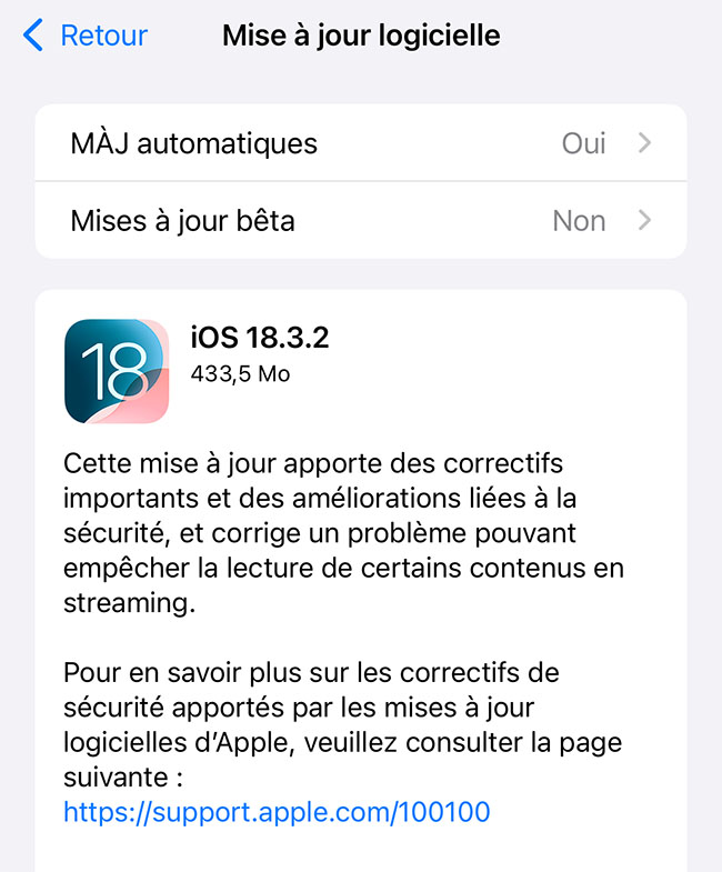 Apple indique que la mise à jour 18.3.2 d’iOS et iPadOS apporte les changements suivants :
